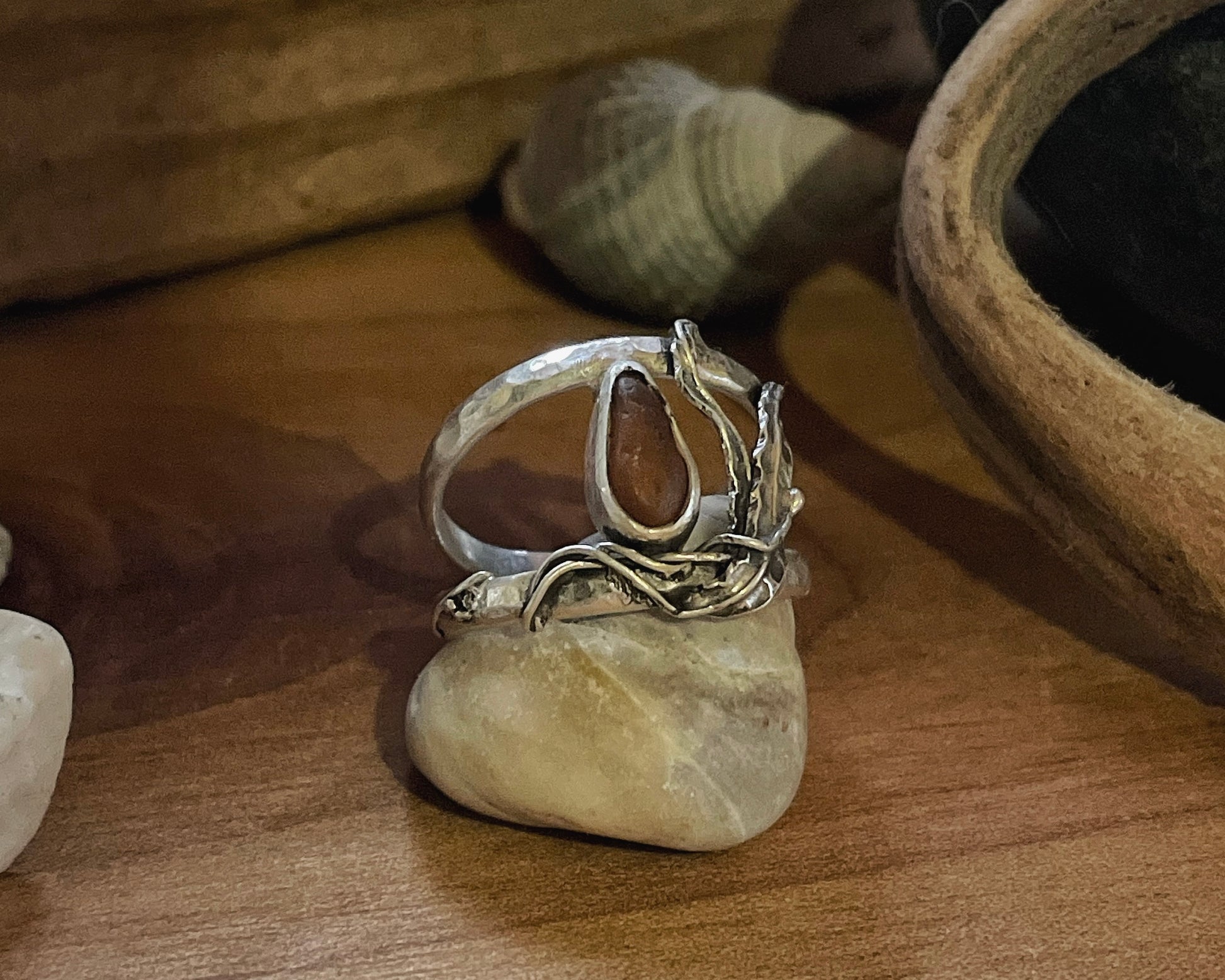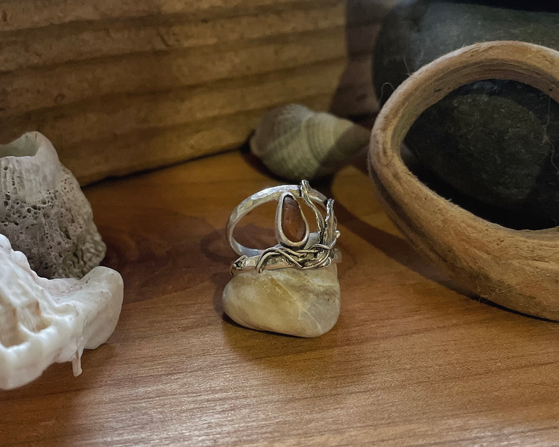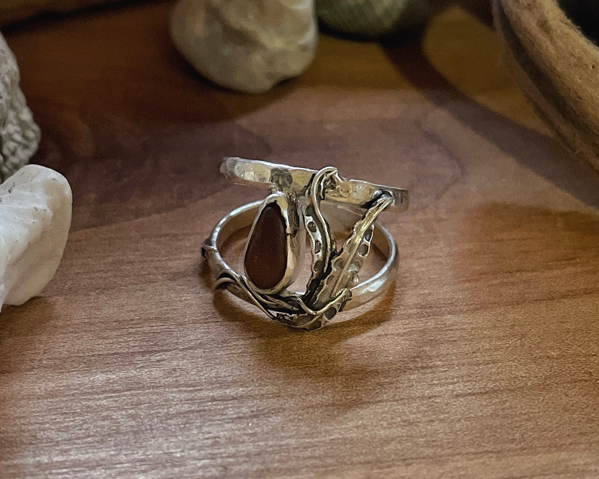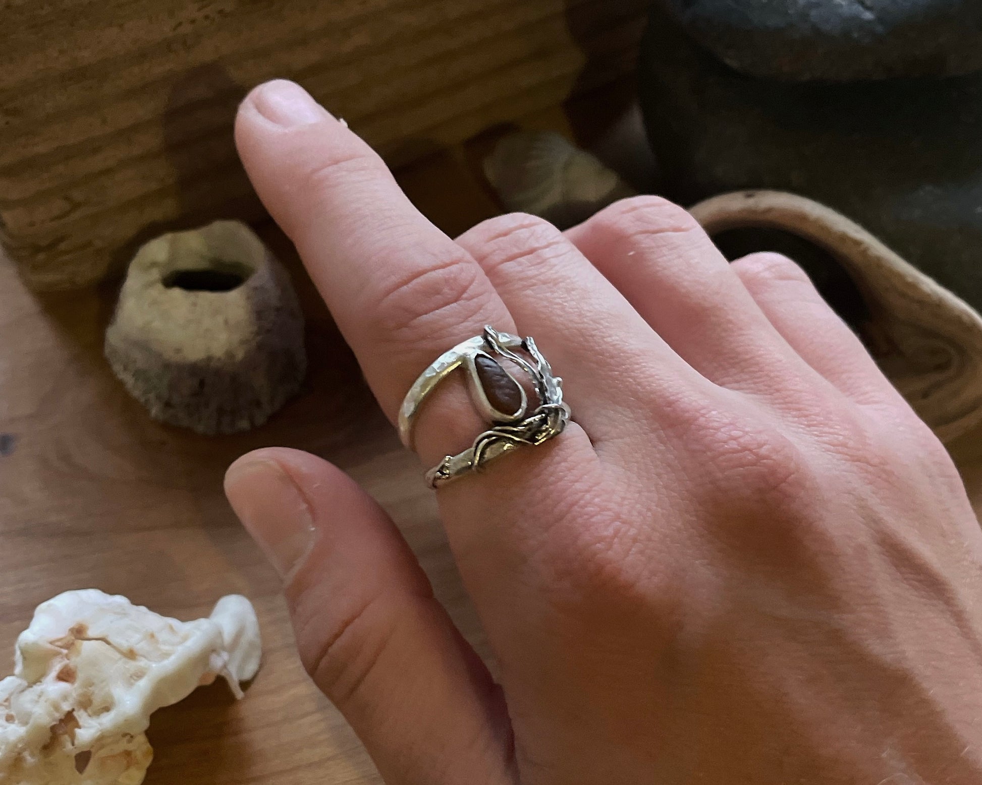 Dark brown sea glass surrounded by hand-fabricated sterling silver A. Marginata, the winged kelp, commonly found in the Salish Sea.