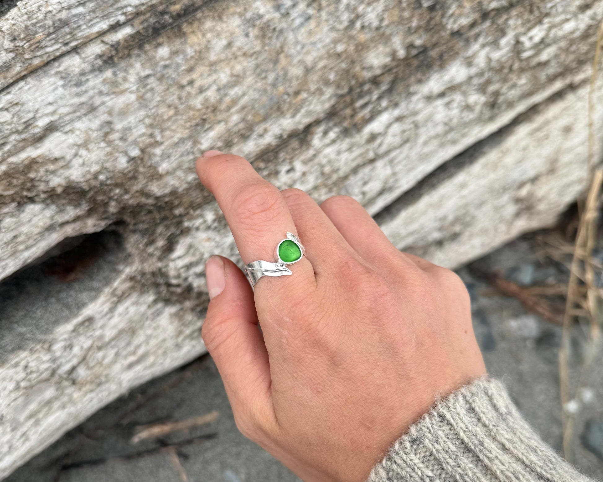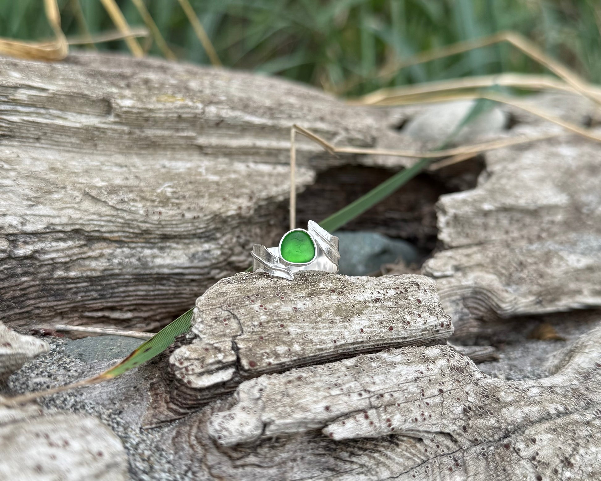 Green seaglass set on a delicate, kelp-inspired band
