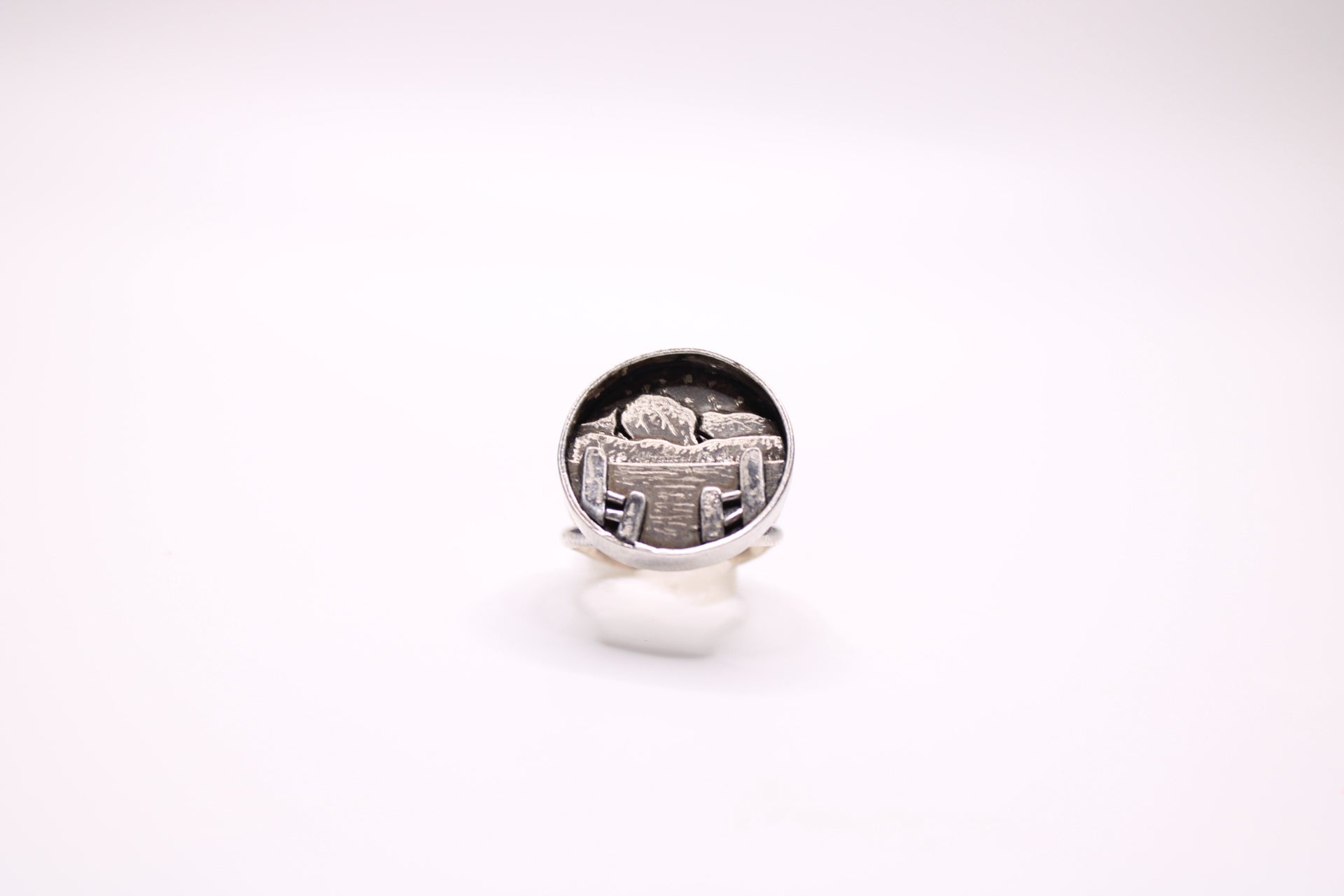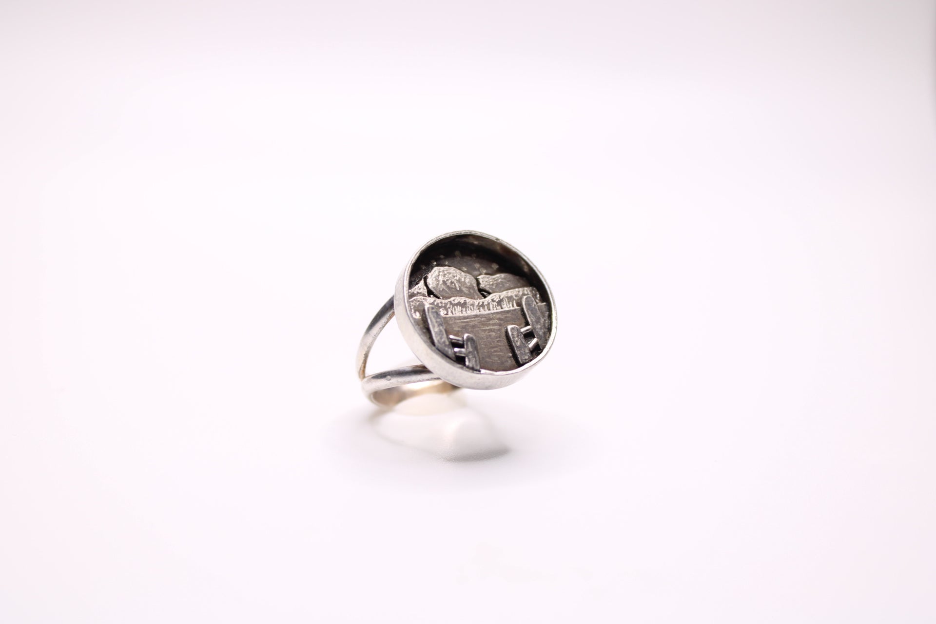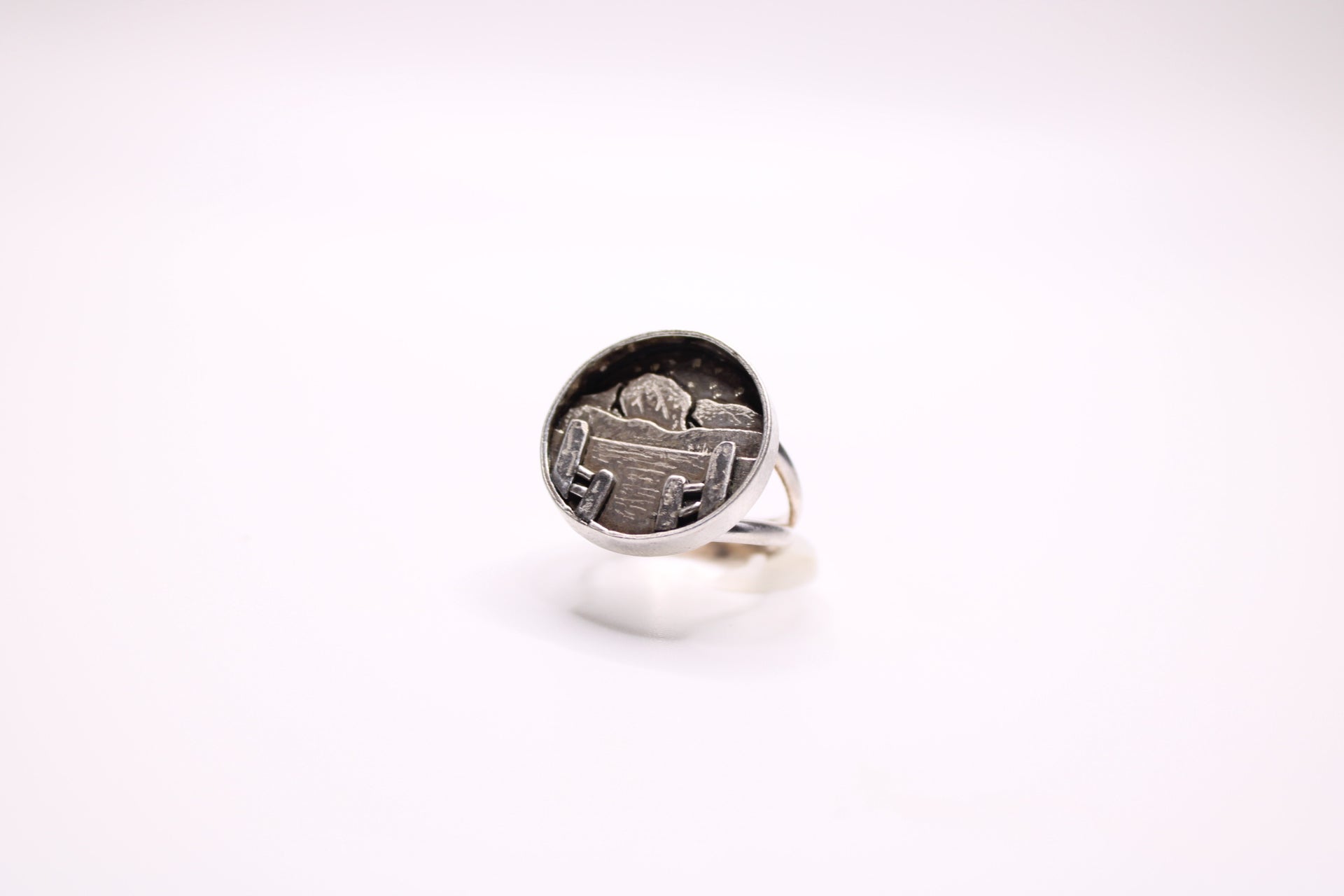 A hand-fabricated scene featuring 6 layers of engraved sterling silver depicting mountains, water, and a boardwalk fence.