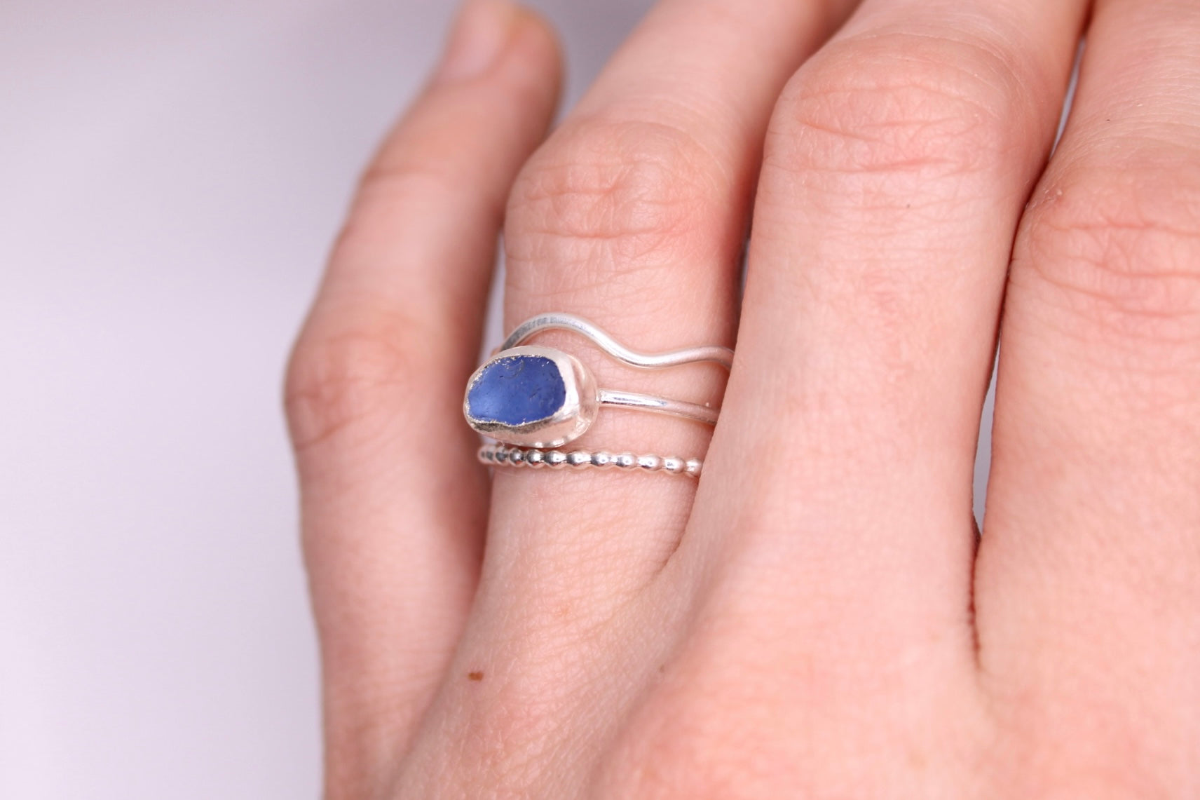 A dainty ring set featuring a wavy band, a "bubbled" band, and a simple band with rare cornflower blue sea glass.