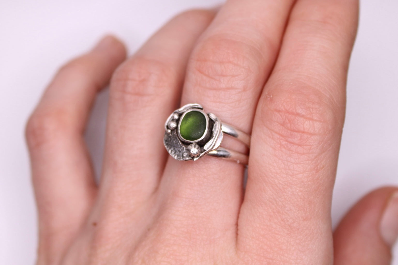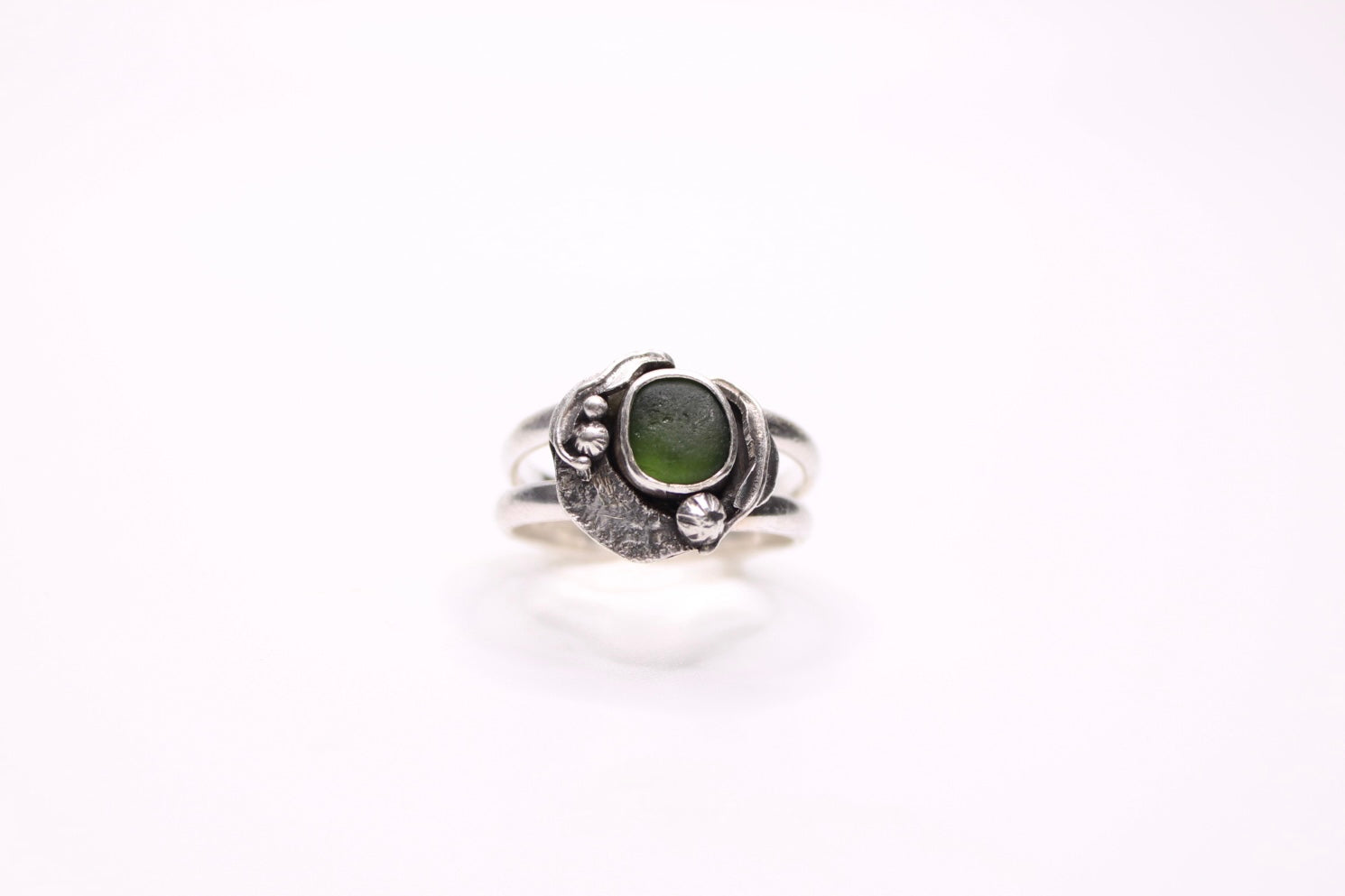 Emerald green sea glass is nestled in a setting reminiscent of a tide pool: find here some drifting kelp, textured rock, and tiny barnacles.