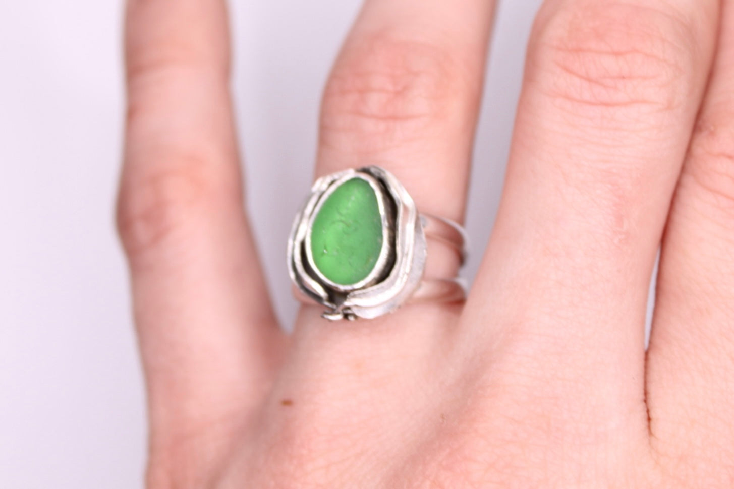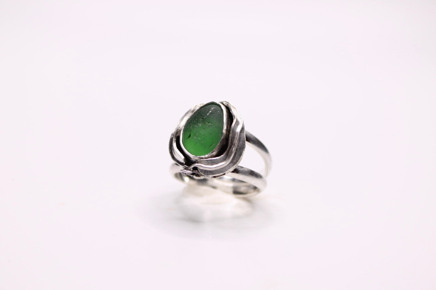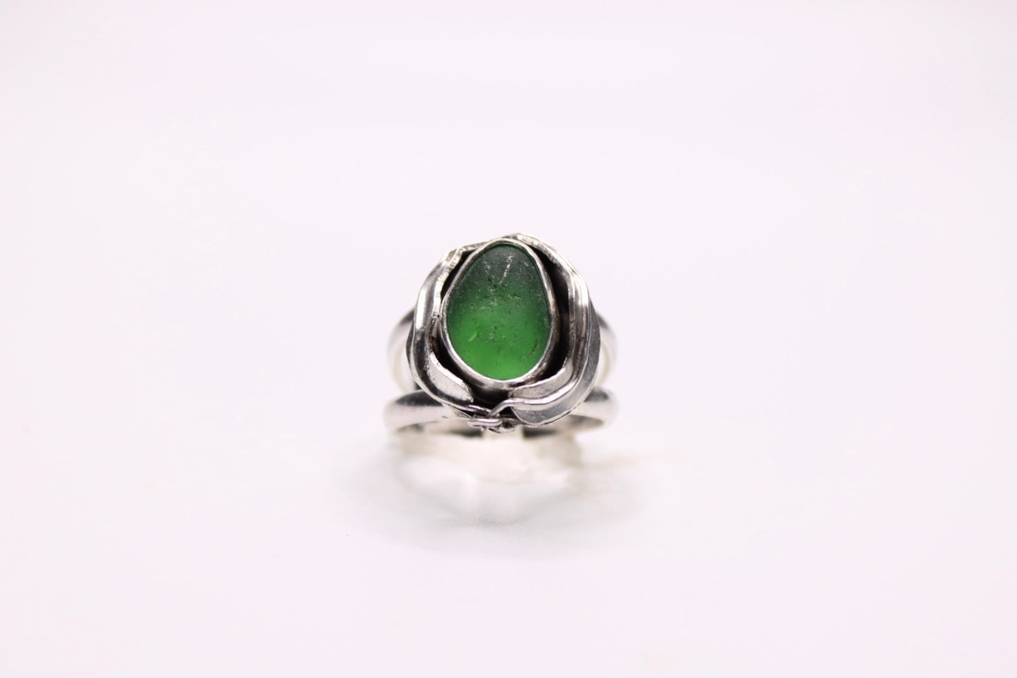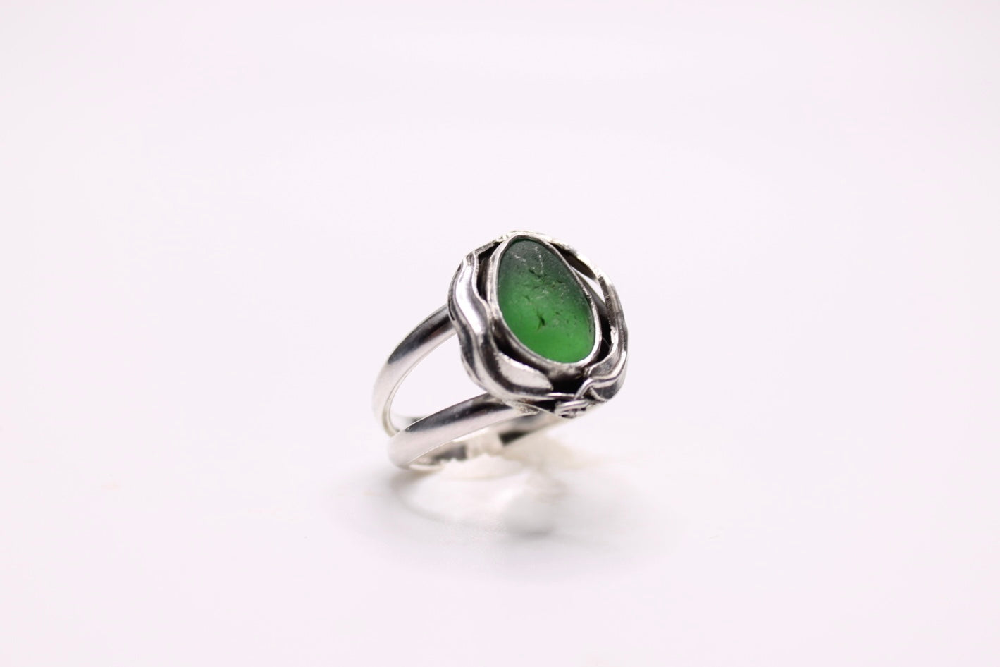 A striking piece of emerald pacific coast sea glass is nestled within drifting kelp.