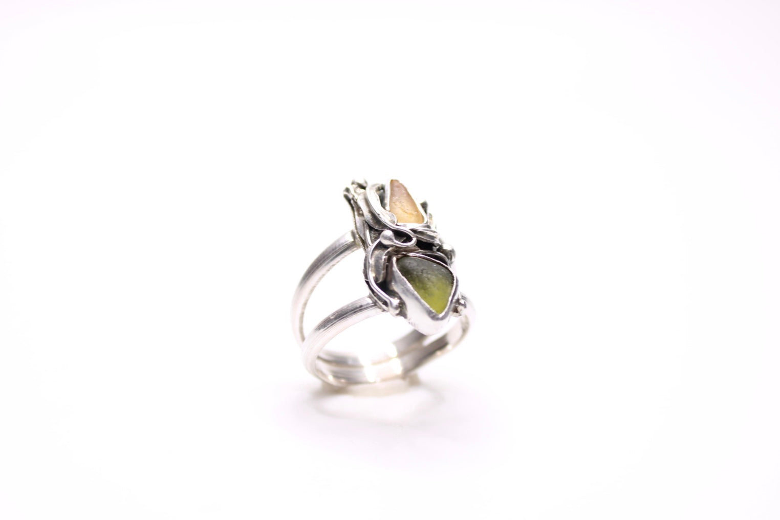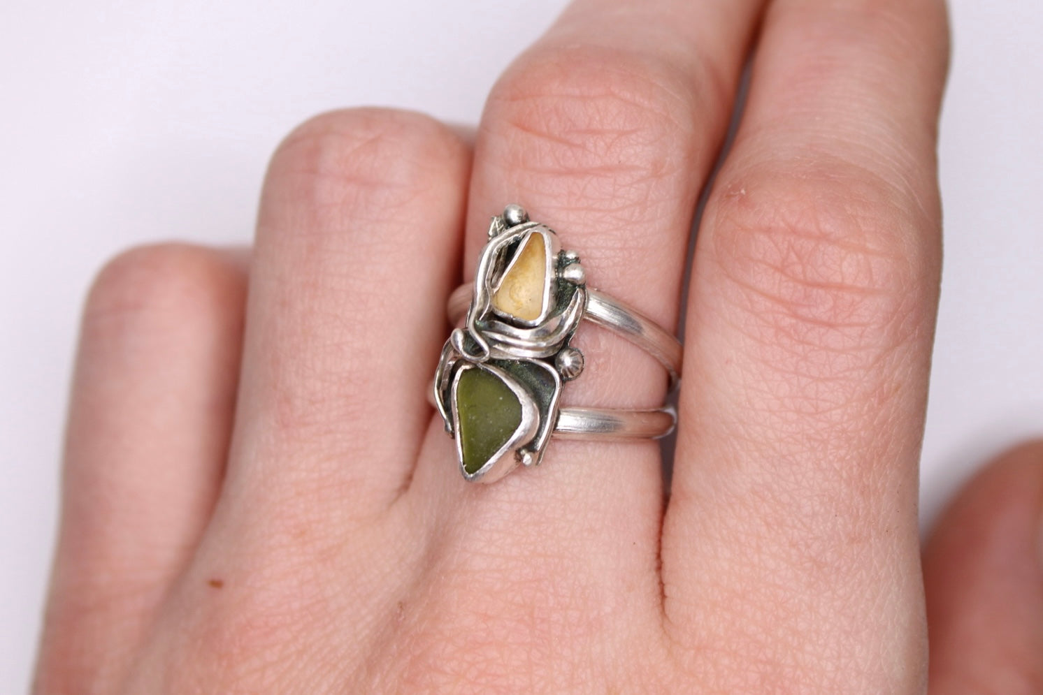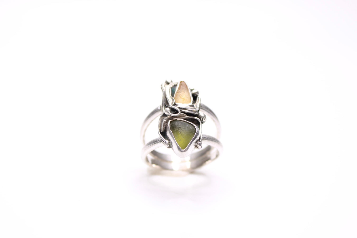 Tangled kelp wraps around rare light yellow and olive green pacific coast sea glass.