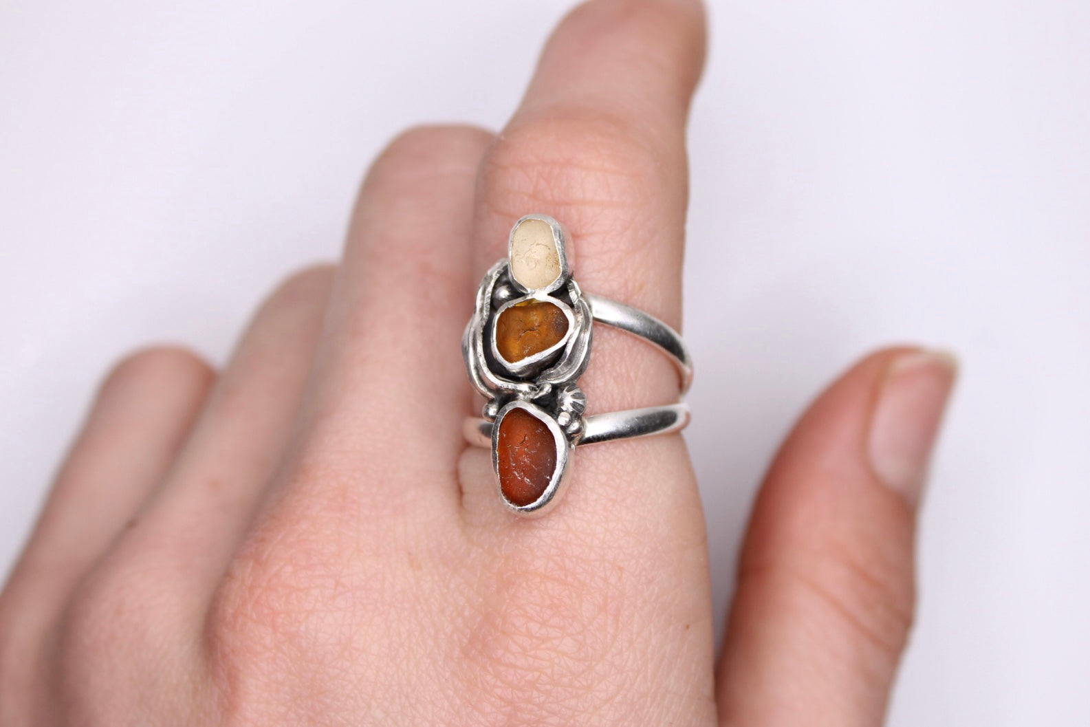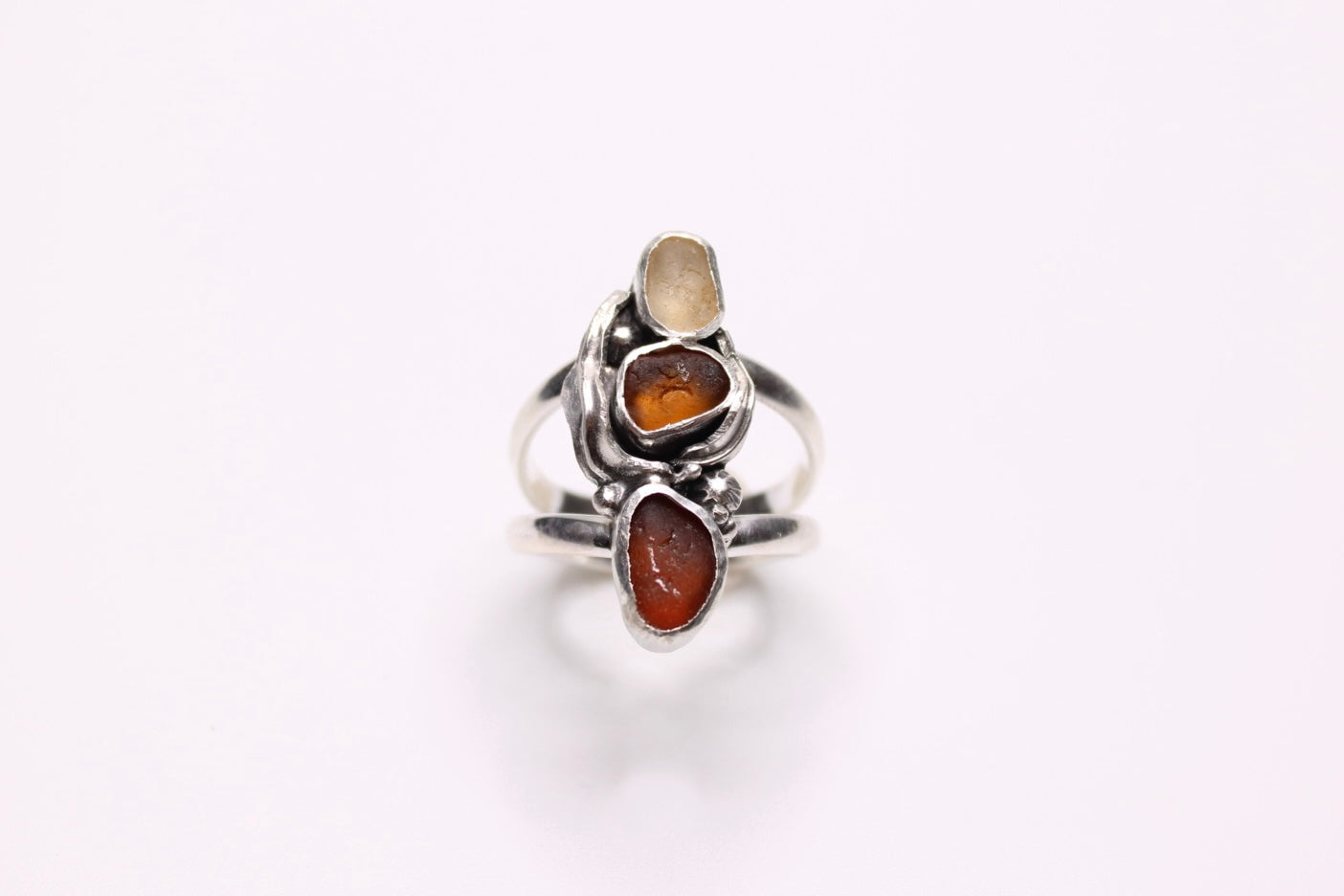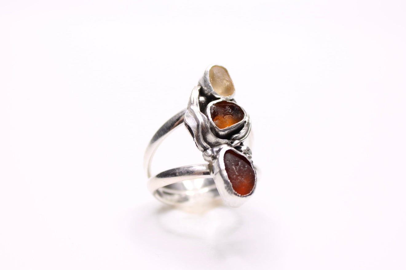 Ombré light yellow, amber, and dark brown Pacific coast sea glass surrounded by drifting kelp and hidden barnacles.