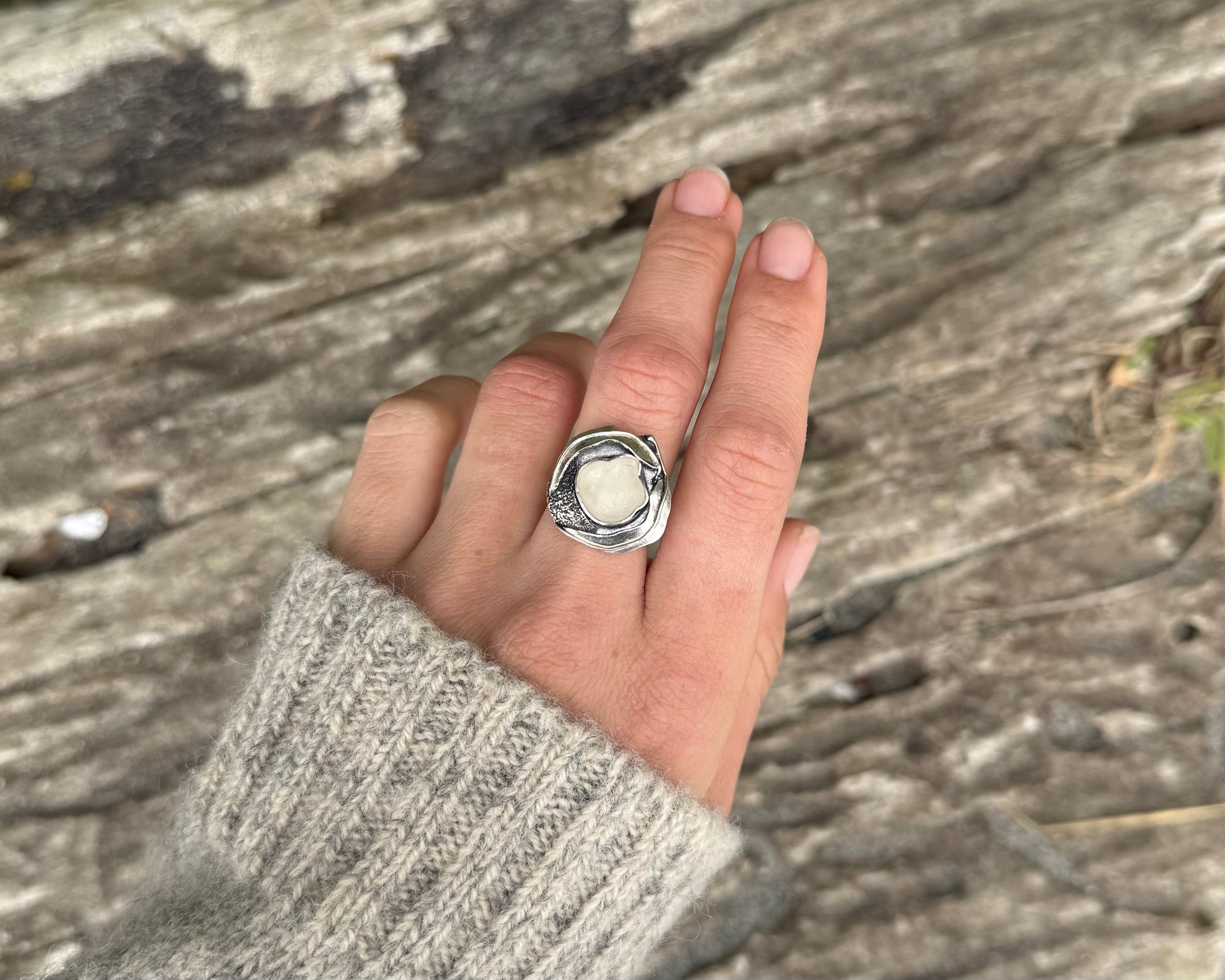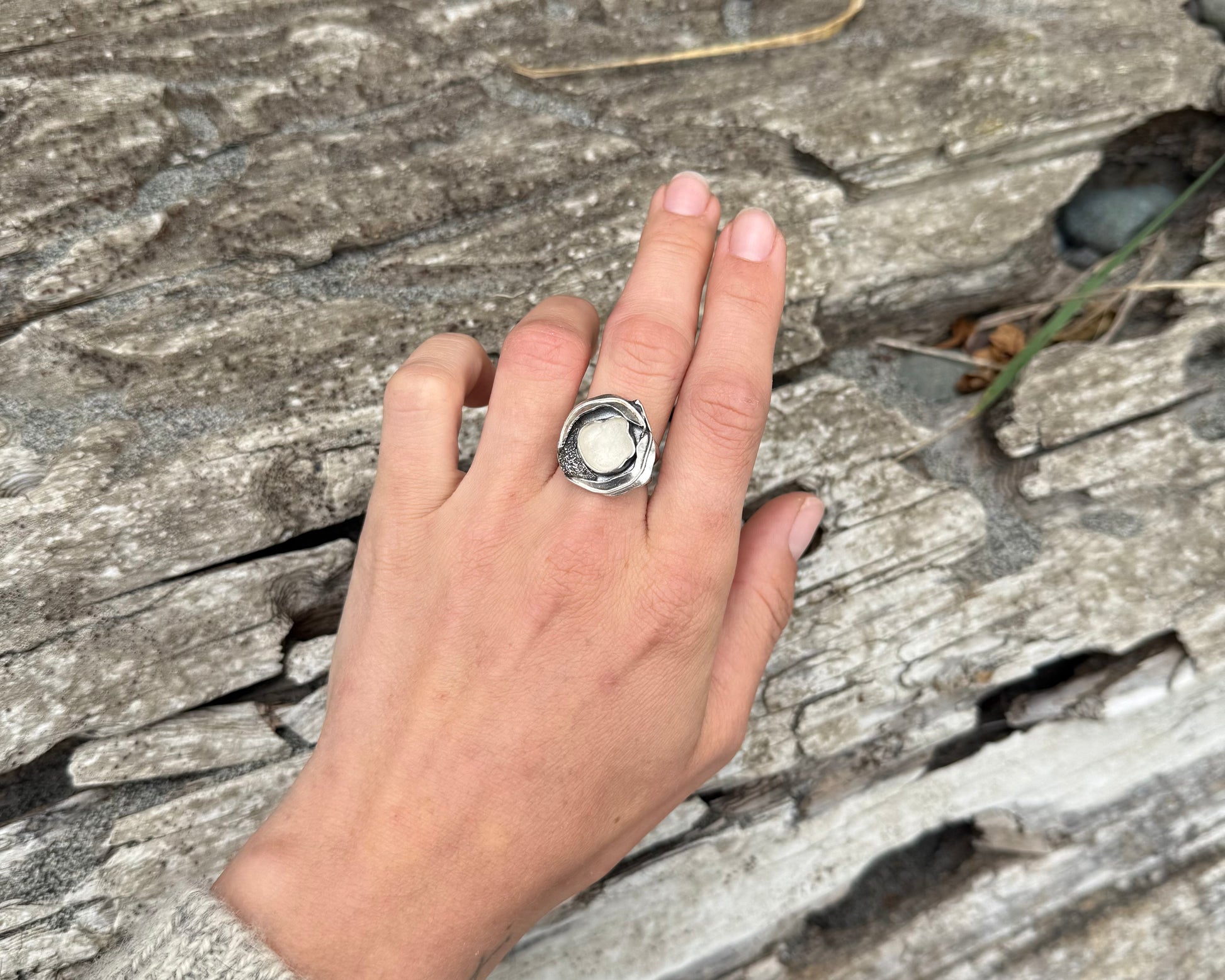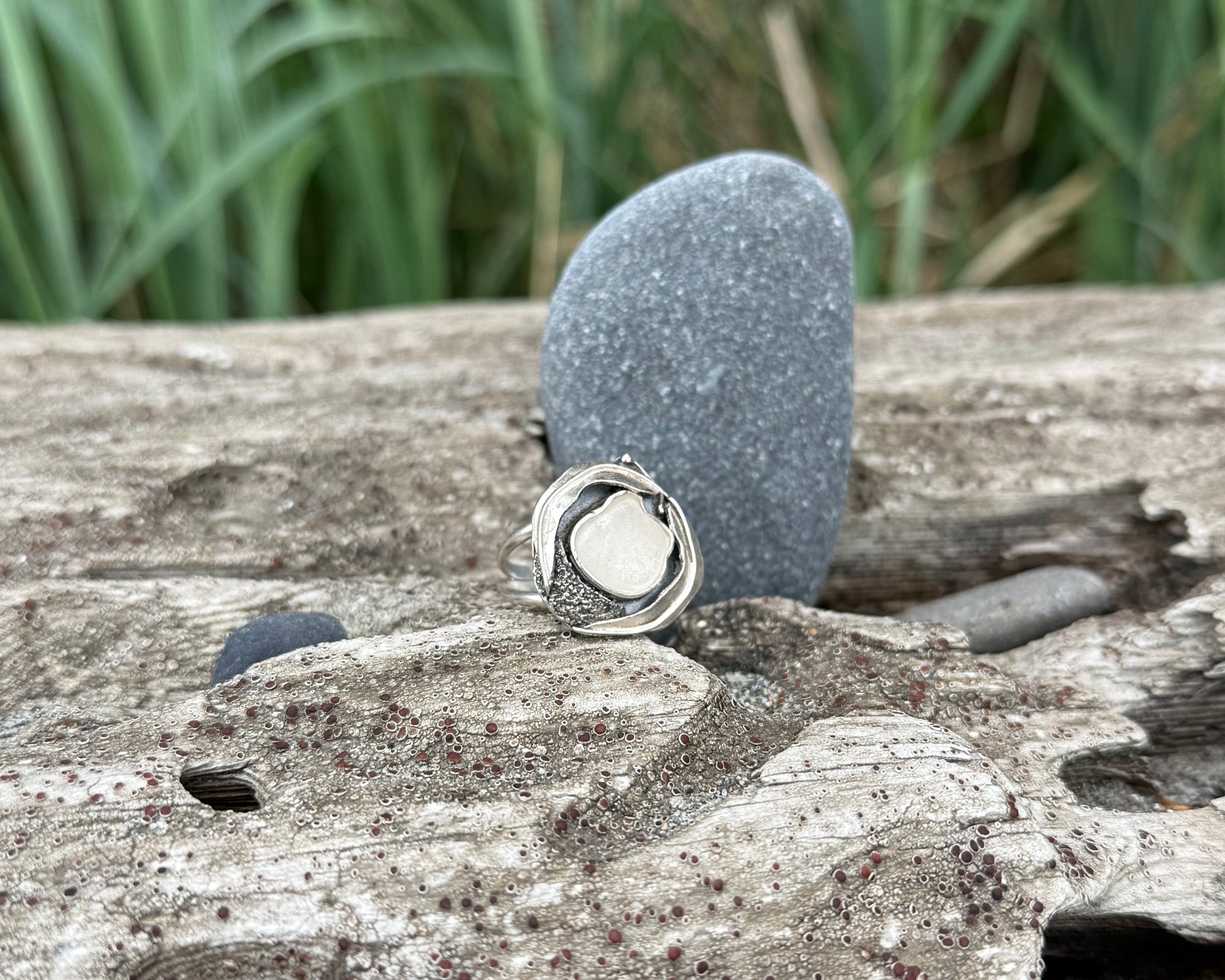 White seaglass is nestled within a modern, simple setting reminiscent of a tide pool