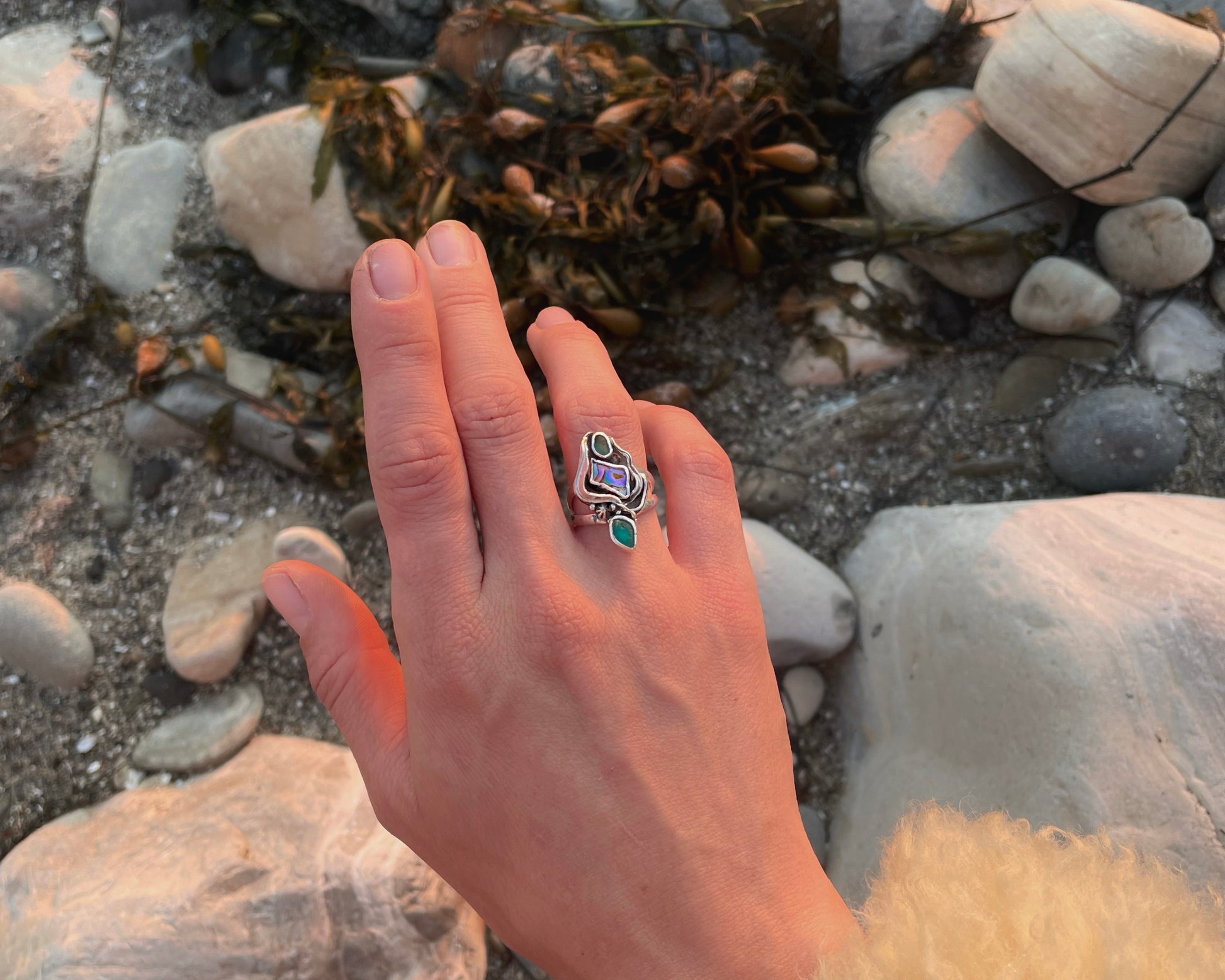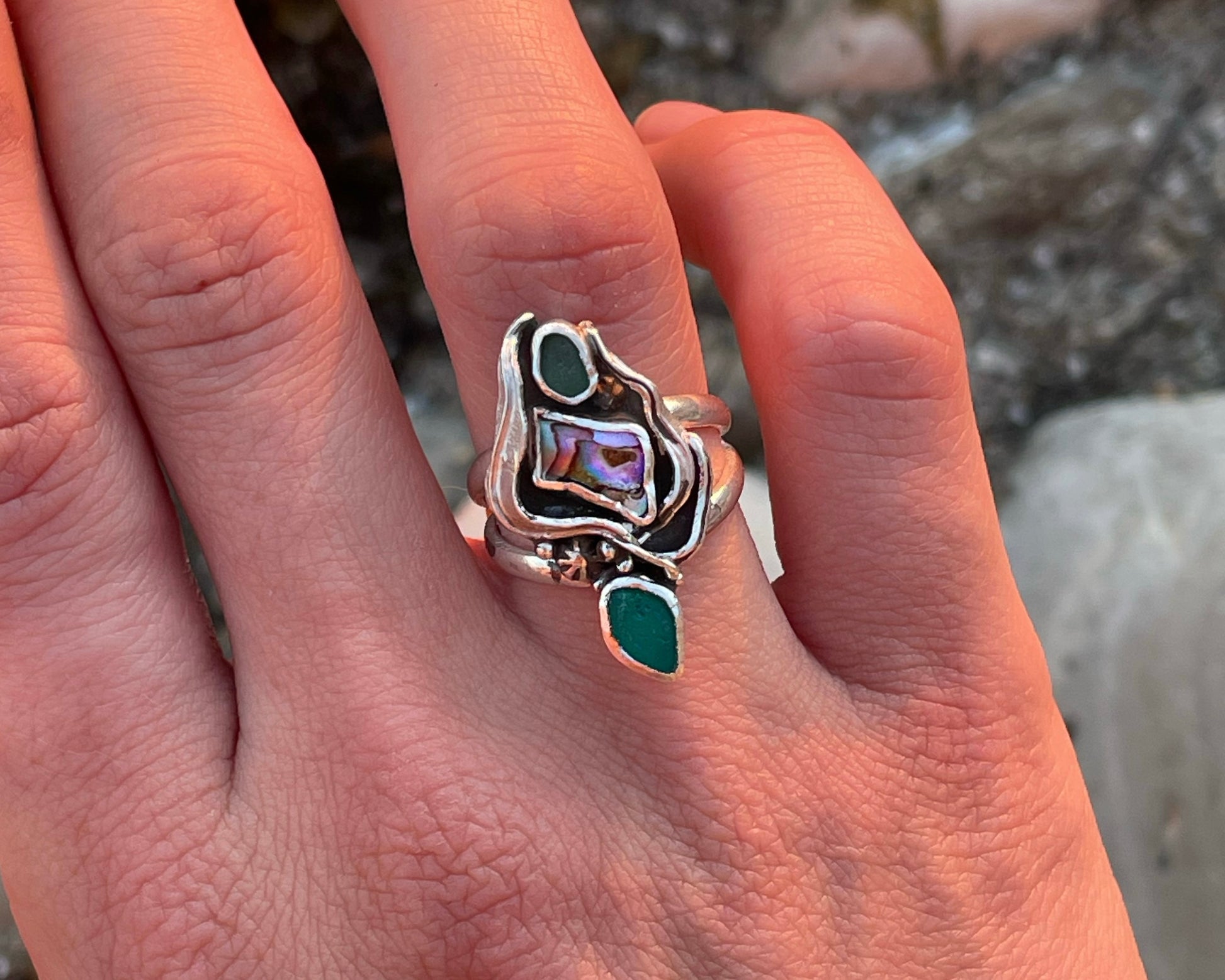 Ultra rare teal and turquoise sea glass nestled amidst sea-tumbled abalone shell and three pieces of swirling, drifting "kelp" with plenty of hidden "barnacles" in this heirloom ring.