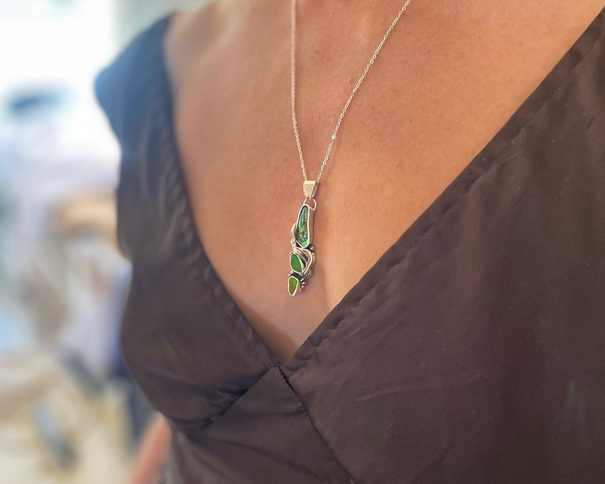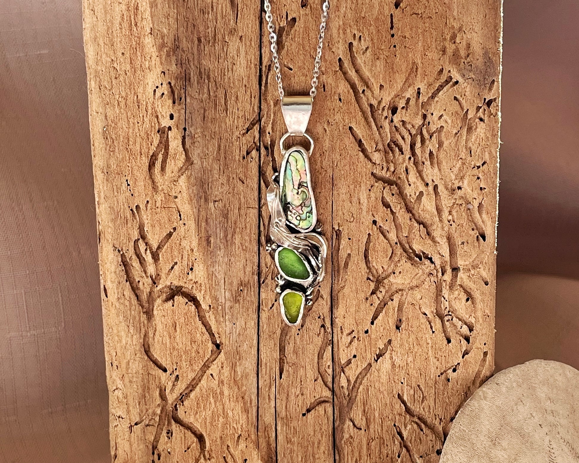 A cascading pendant featuring abalone shell, vibrant green and lime green sea glass, surrounded by free-form flowing "kelp," with plenty of hidden "barnacles" and "bubbles.