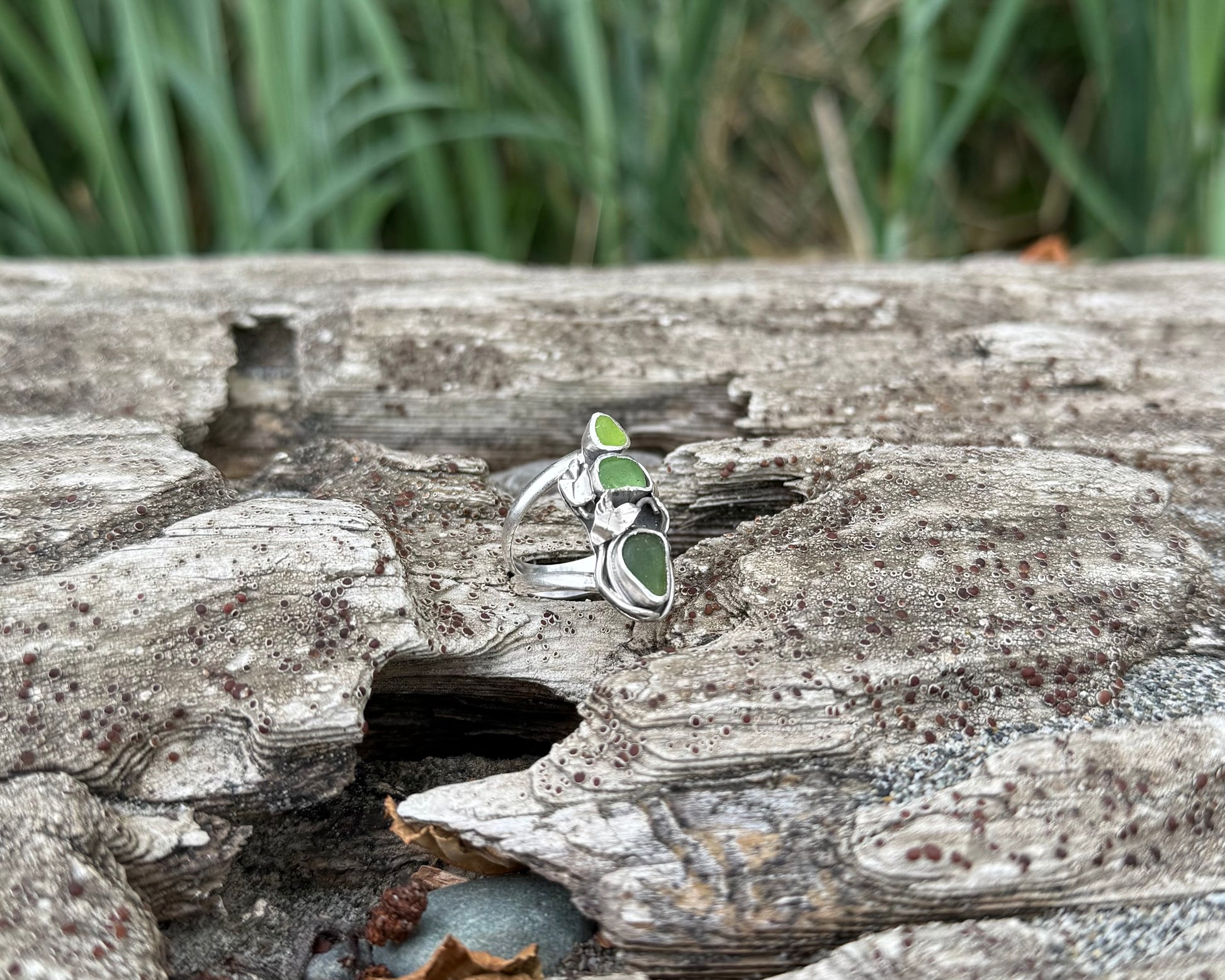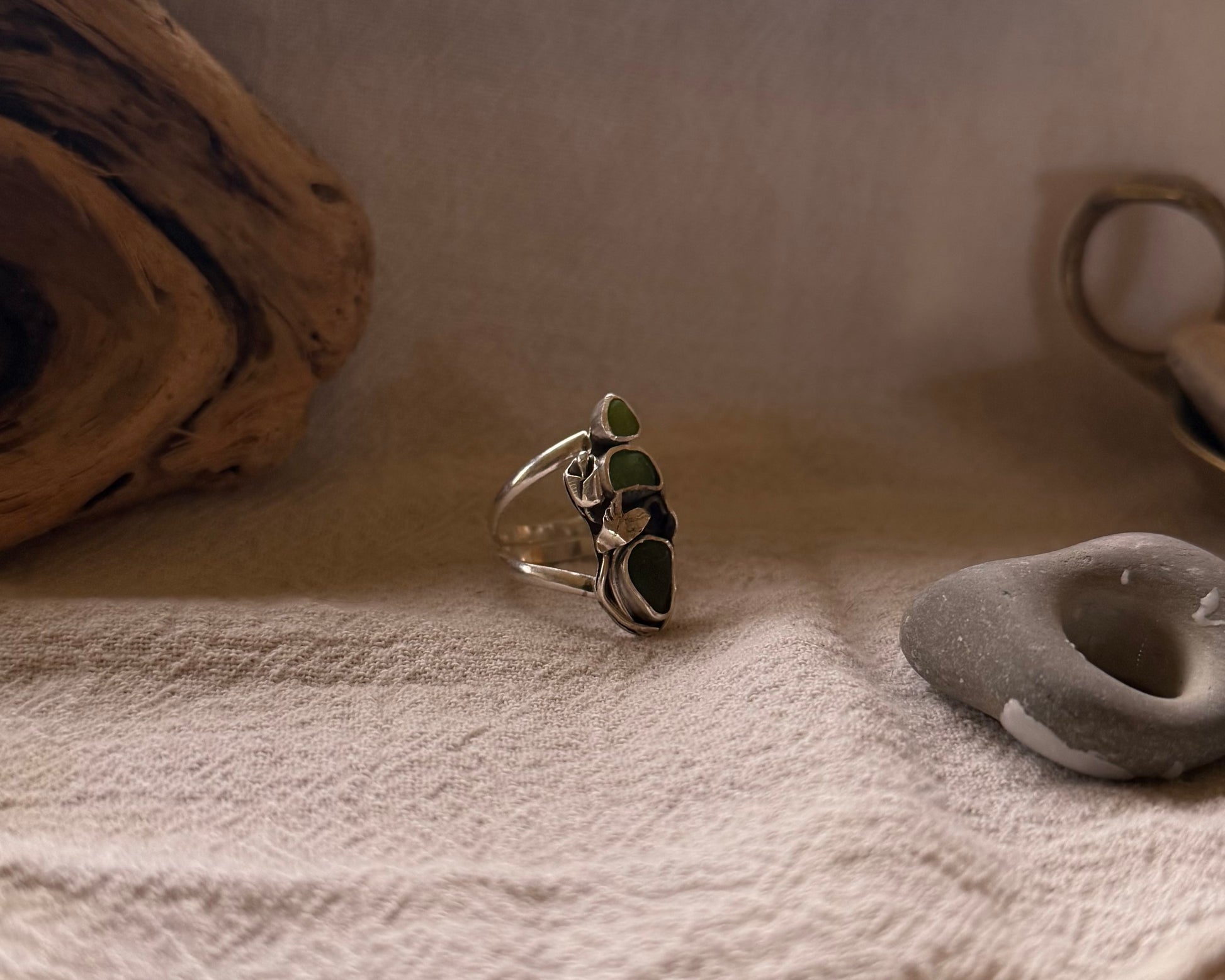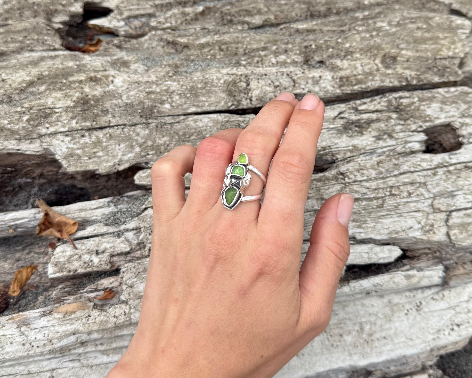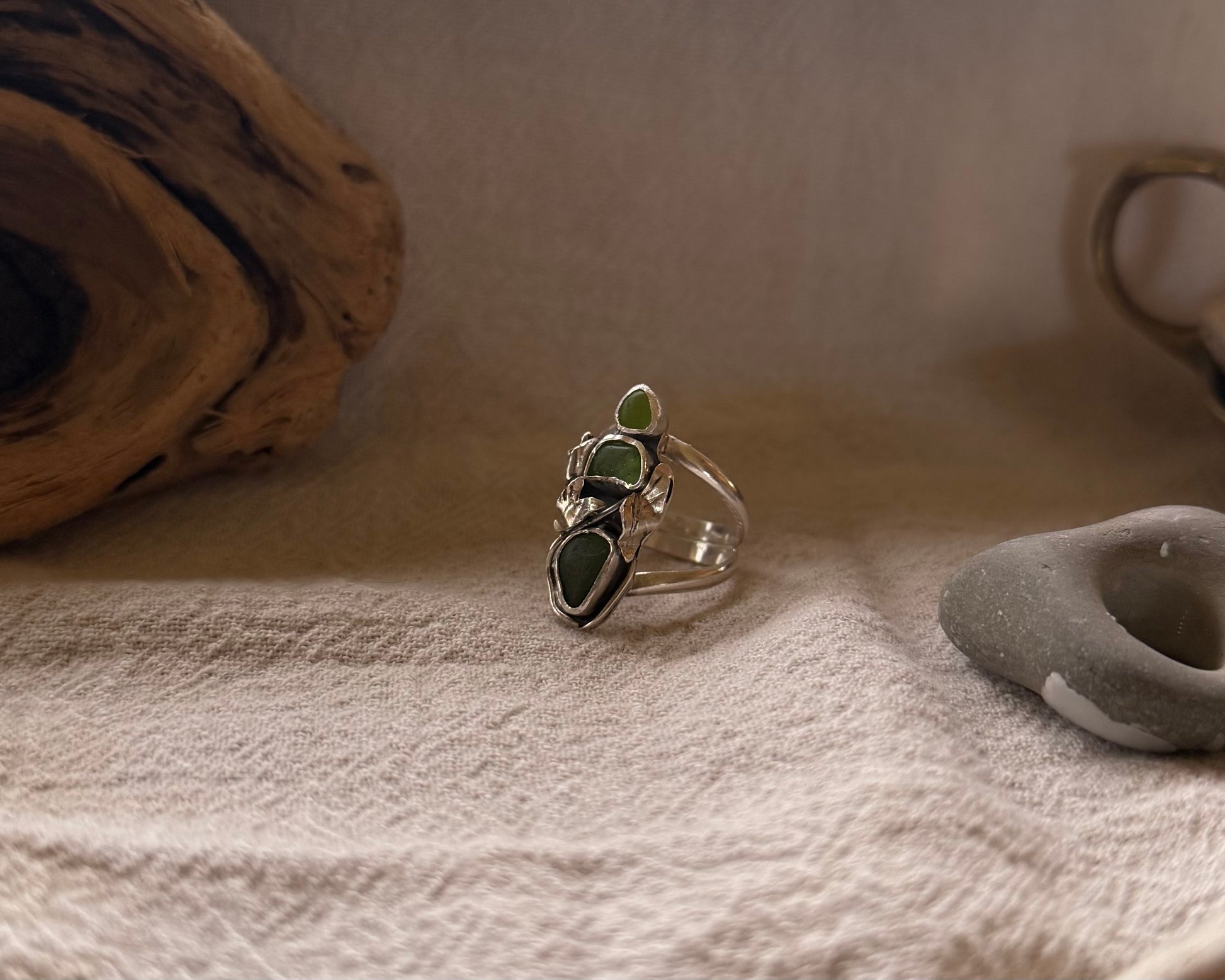Three shades of cascading green sea glass are nestled in a hand-fabricated pond lily leaf and flower setting