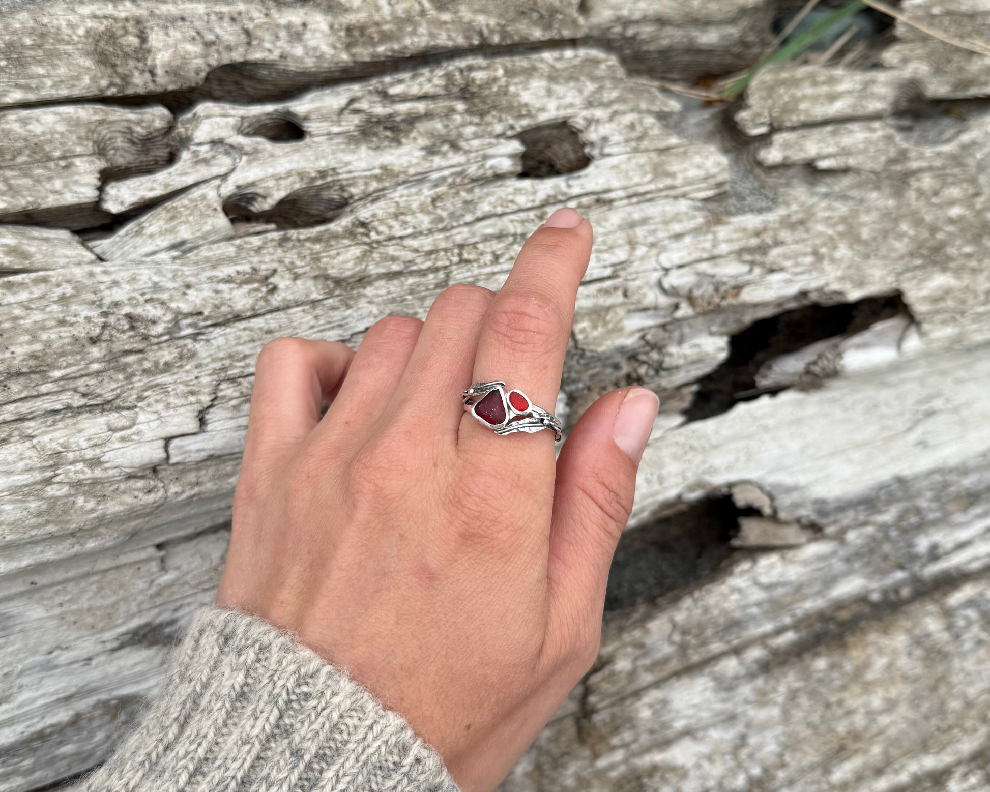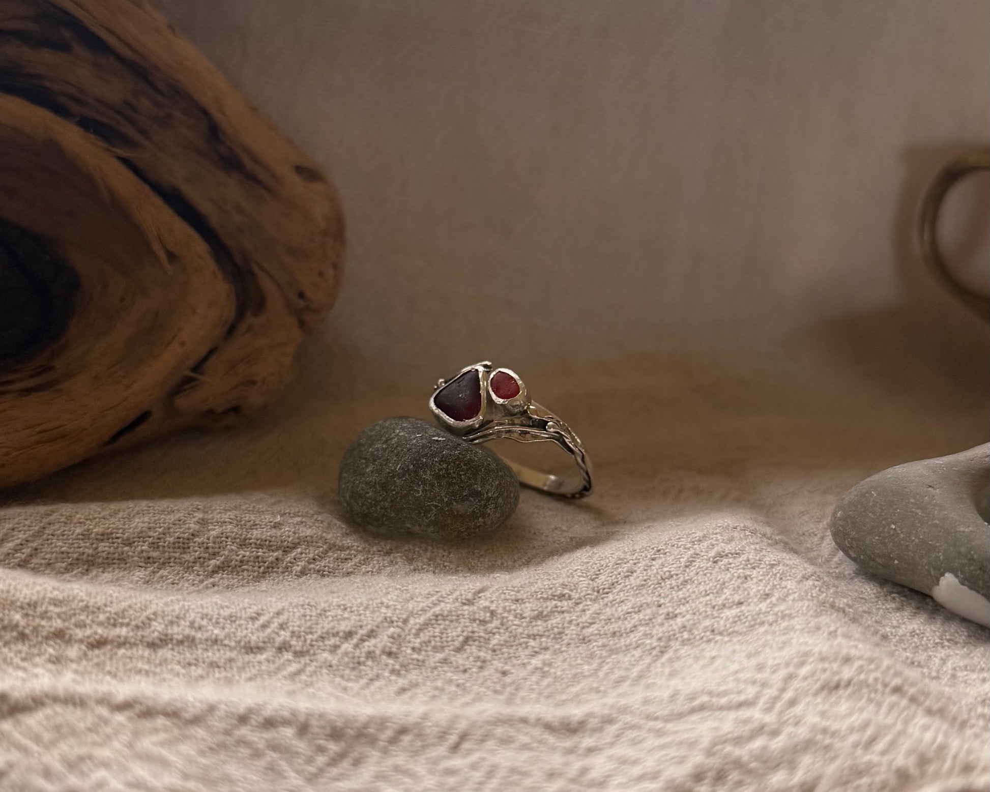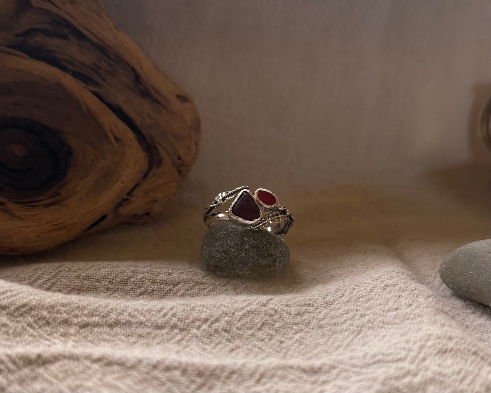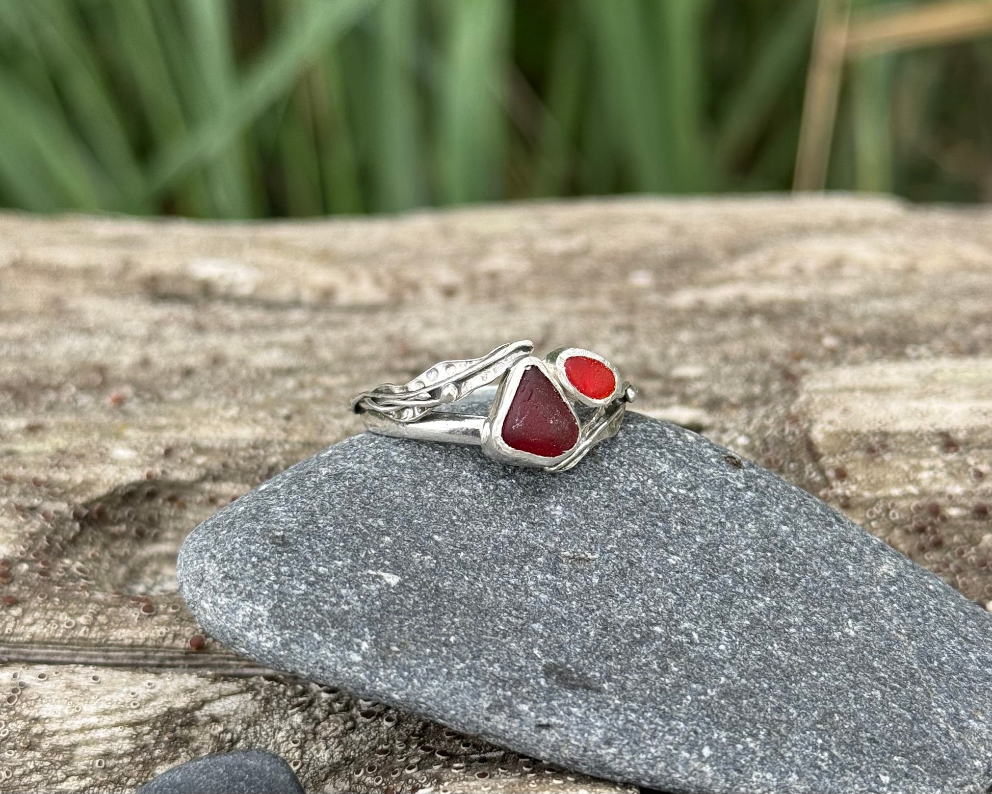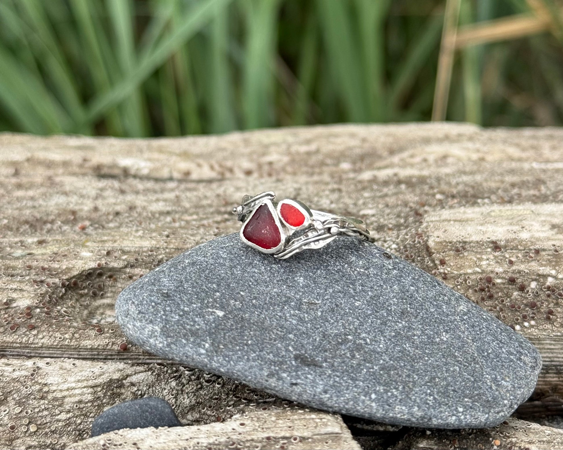 Two different shades of ultra rare red seaglass set amidst mirrored pieces of drifting kelp leaves and bulbs