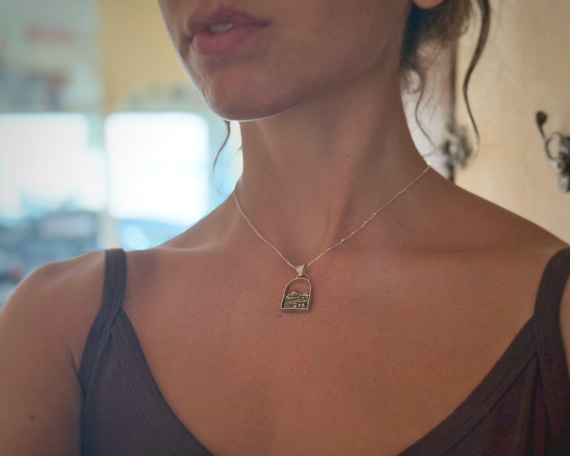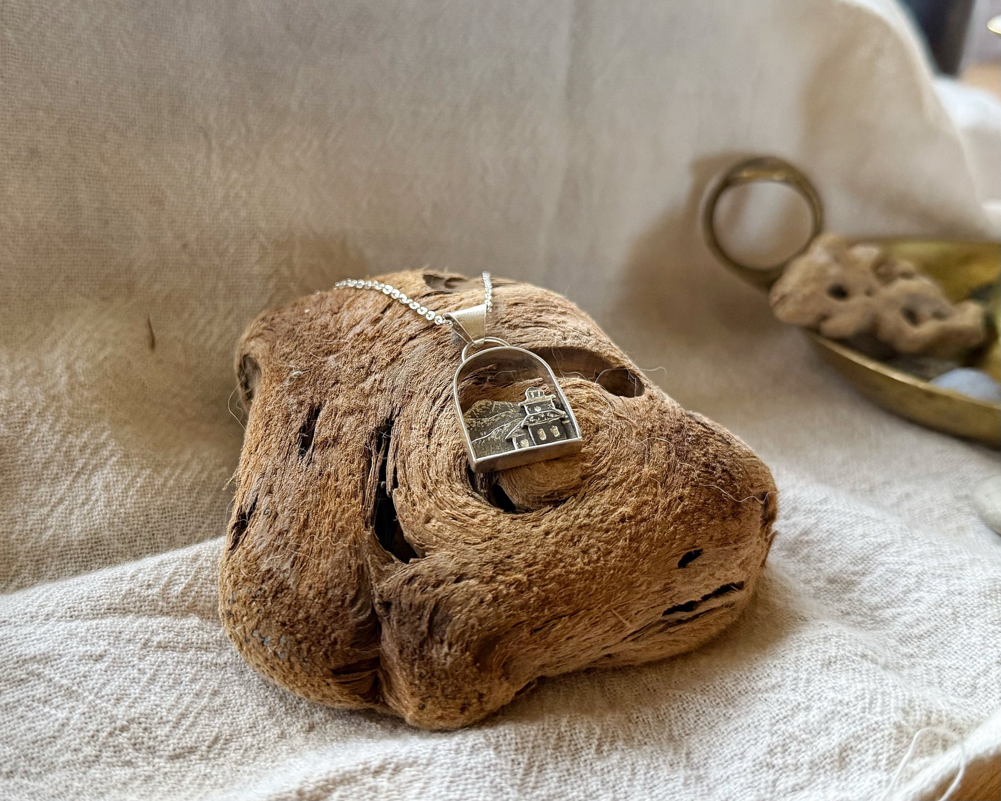A striking yet delicate lighthouse vignette pendant with a hollow, peek-a-boo back. Set on a fully adjustable sterling silver chain