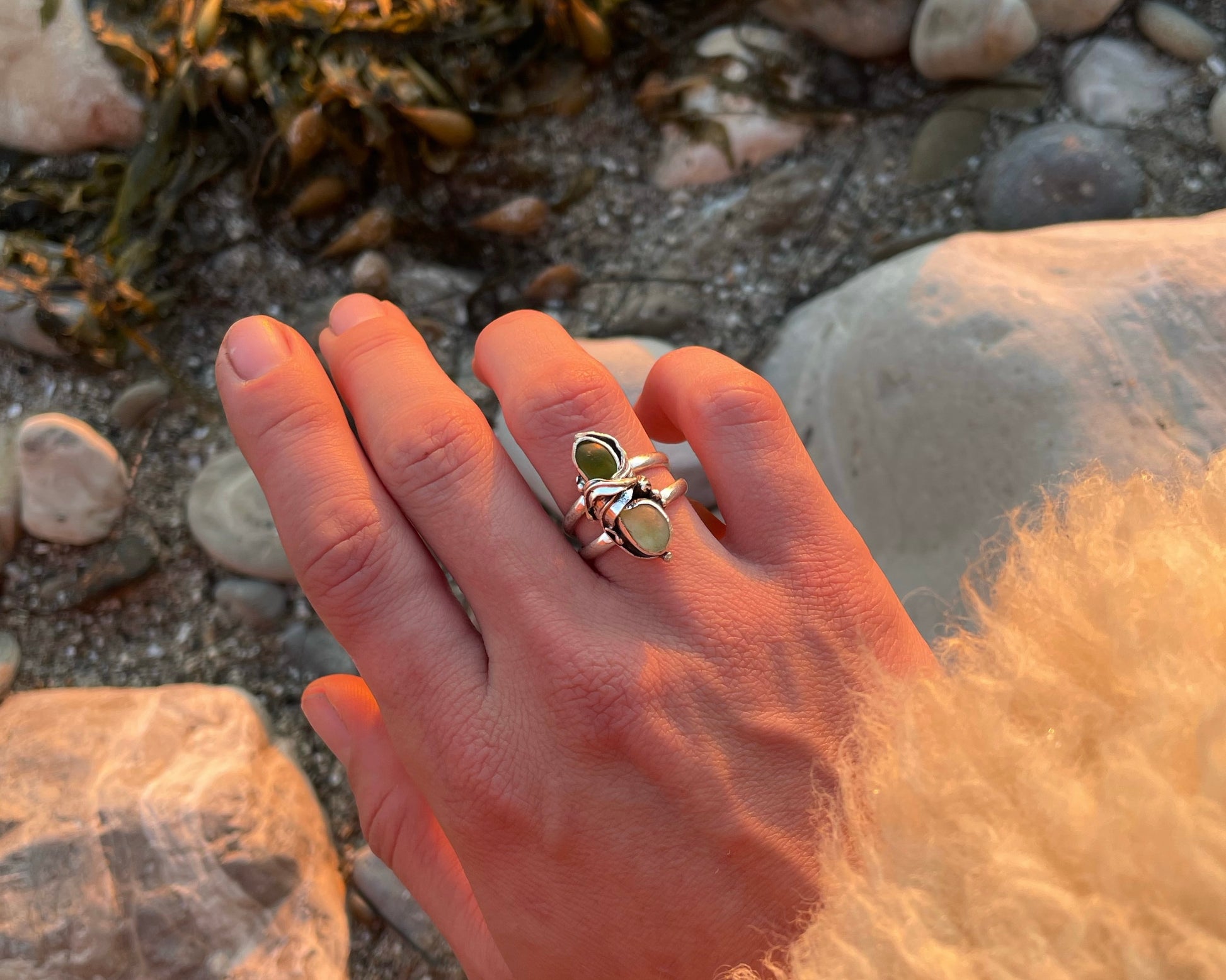 Rare olive green and sea foam green sea glass is nestled amongst drifting "kelp" and hidden barnacles.